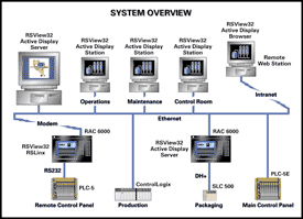 RSView32 Active Display System™可以将RSView32的监控延伸成客户/服务器结构。用户可以在远程的客户端实时地看到监控画面,并且可以控制。这是一个完全互动的远程监控,用户可以在任何网络上不同的客户端上都看到相同的监控画面,并根据权限的许可进行控制。通过这种方案,可以将监控延伸到工厂的任何需要的地方,包括办公室。RSView32 Active Display System充分利用了微软的分布式组件对象模型-DCOM和ActiveX技术,让远程的客户端得到快速的,实时的监控画面,就如在本地一样。